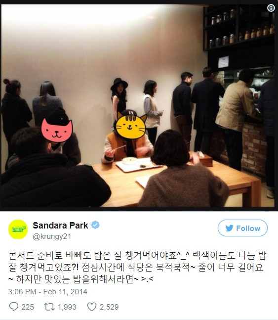 Sandara Park (2NE1) là một khách hàng quen thuộc ở quán, khi cô thích hầu hết các món ăn tại đây. Dara cũng chẳng ngại xếp hàng chờ đến lượt mình như mọi người, vì theo Dara thì chất lượng món ăn quá ngon, có mất thời gian chờ đợi cũng xứng đáng mà thôi.