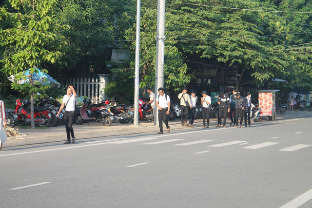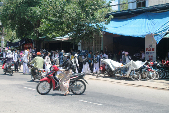 Sau giờ tan trường, học sinh trường THPT Võ Nguyên Giáp và trường THPT Huỳnh Thúc Kháng đến điểm trông giữ lấy xe máy rồi vô tư... vút ga. Nhiều học sinh chở 3, không đội mũ bảo hiểm, đi ngược chiều trong giờ cao điểm gây nên tình trạng lộn xộn, mất an toàn giao thông.