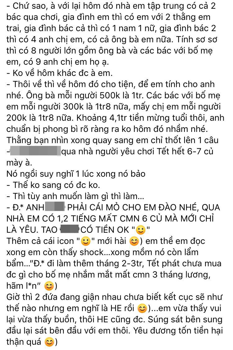 Cô bạn gái còn tính hẳn cho tiền lì xì gần như cả "gia phả" khiến chàng trai này không đỡ nổi. Theo dõi toàn bộ sự việc bi hài của bạn mình, anh bạn này quyết định chia sẻ với cộng đồng mạng.