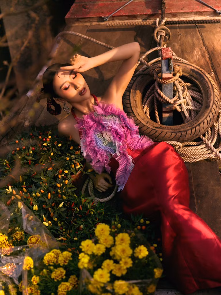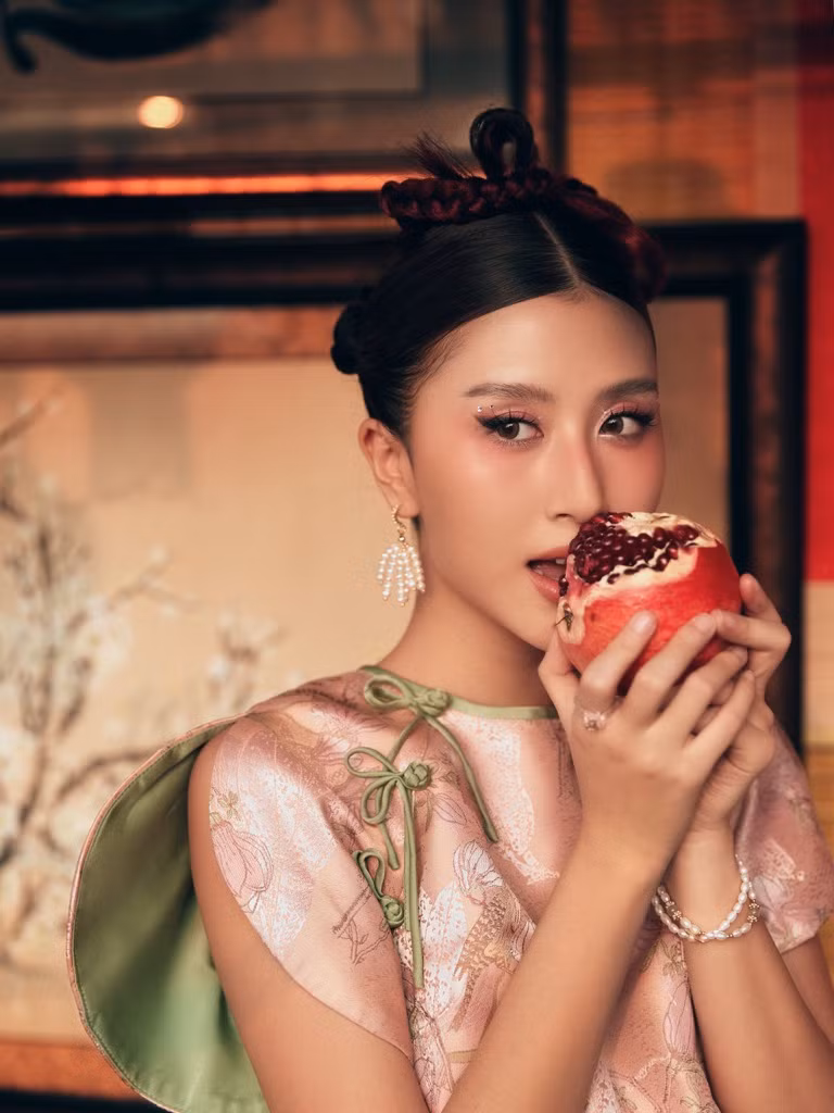 Trở lại cùng loạt ảnh mới, Quỳnh Anh Shyn lựa chọn trang phục gấm với hoạ tiết hoa văn tinh tế, sắc sảo và kiểu dáng cách tân từ phần cổ áo dài truyền thống. Quỳnh Anh Shyn thể hiện hình ảnh của một cô gái truyền thống nhưng không kém phần hiện đại, trẻ trung.