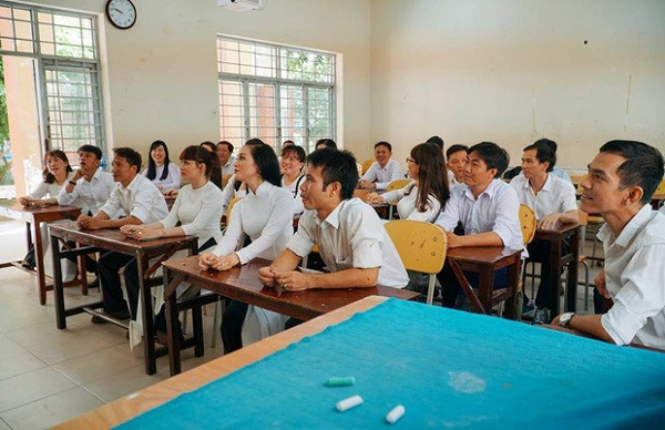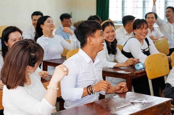 "Nghẹn lòng lắm. Tụi chị khóc rồi cười mấy chặp. Không nghĩ sẽ có cơ hội ngồi lại cùng nhau trong một lớp học như cái thời còn hồn nhiên, vô tư ấy" - chị Khổng Quỳnh Nga - một thành viên của lớp 12A2 chia sẻ.