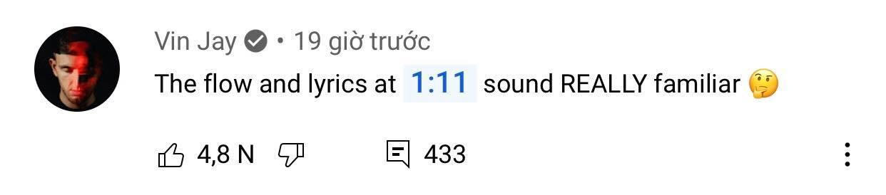 Trong khi netizen vẫn đang tranh cãi thì mới đây, rapper Vin Jay đã vào phần trình diễn của Dlow và để lại bình luận đầy ẩn ý "The flow and lyrics at 1:11 sound REALLY familiar" (tạm dịch: Flow và lời ở phút 1:11 thật sự nghe rất quen). Chưa đầy 24h đăng tải, bình luận này đã nhận được hàng ngàn lượt like từ netizen. Đa số cư dân mạng cho rằng, nam rapper đang ẩn ý việc Dlow đã sử dụng 2 câu rap giống với sản phẩm đã ra mắt trước đây của mình.