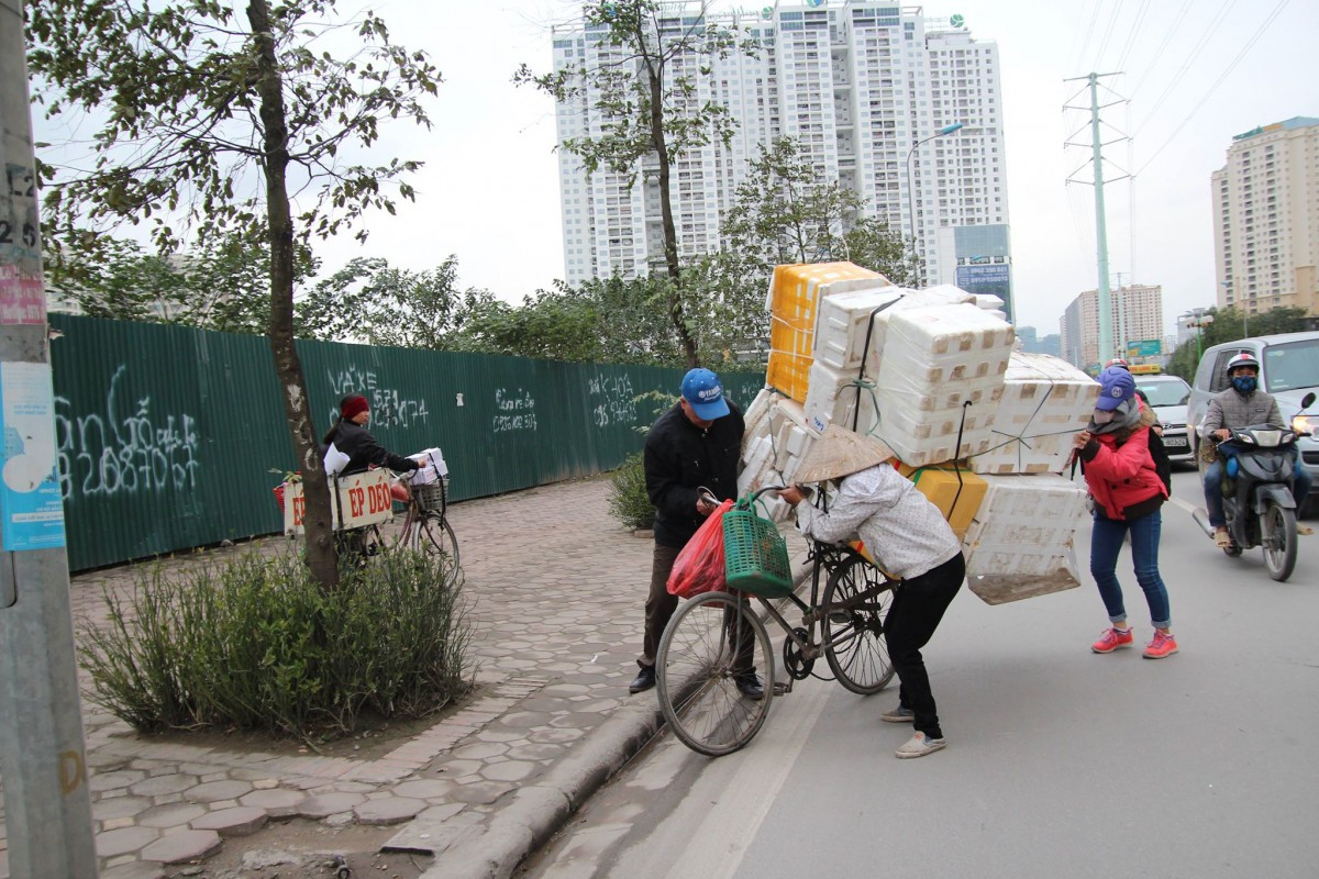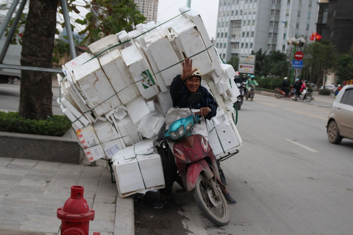 Một người nhặt phế liệu chở hàng cồng kềnh được một số người đi đường giúp sức sau khi bị gió quật đổ.