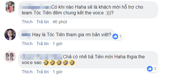 Trước động thái vô cùng bất ngờ này của Haha, nhiều người hâm mộ đã đặt ra hàng loạt các giả thuyết. Đa số ý kiến đều nghi ngờ Haha chính là nhân tố bí ẩn – anh chàng rapper giấu mặt mà Tóc Tiên đã từng úp mở sẽ hỗ trợ team của cô trong đêm chung kết The Voice sắp tới.
