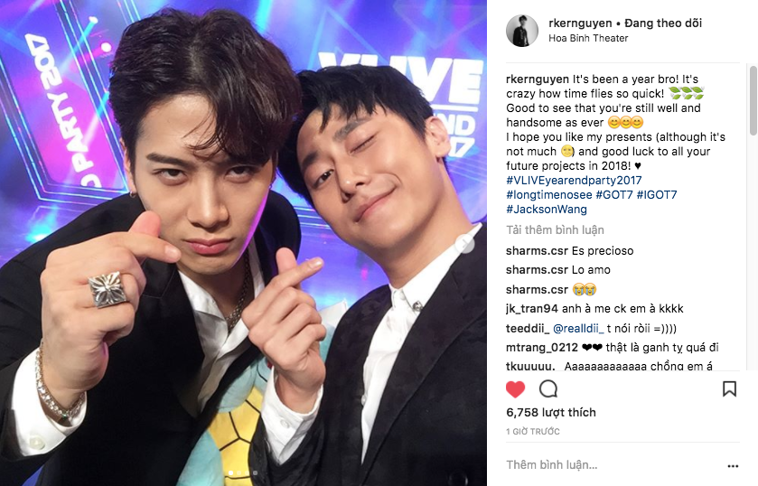 Trên trang cá nhân, Rocker Nguyễn vừa khoe ảnh chụp cùng Jackson Wang trong một sự kiện âm nhạc. Anh viết: “It’s been a year bro! It’s crazy how time flies so quick! Good to see that you’re still well and handsome as ever. I hope you like my presents (although it’s not much) and good luck for all your future projects in 2018!".