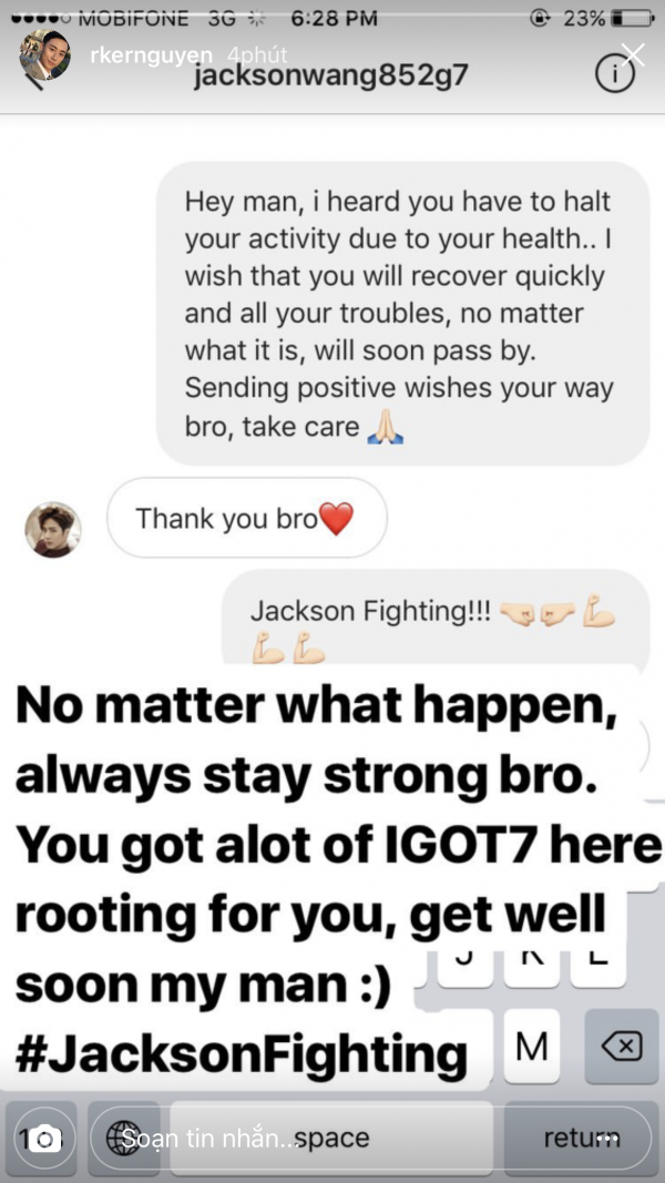Kể từ khi follow chéo nhau trên Instagram, Rocker Nguyễn và Jackson Wang vẫn thường xuyên liên lạc và hỏi thăm lẫn nhau khiến các fan hâm mộ không khỏi phấn khích. Cách đây vài tháng, hai anh chàng còn "hẹn hò" nhau ăn tối trên du thuyền hay trên đảo, và mới đây nhất là lần Jackson phải hoãn hết lịch trình của mình lại do tình trạng sức khỏe không tốt, Rocker đã nhắn tin thăm hỏi khiến cả Jackson và cộng đồng IGOT7 (cộng đồng fan của GOT7) đều cảm kích.