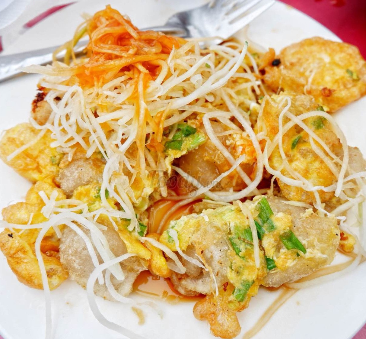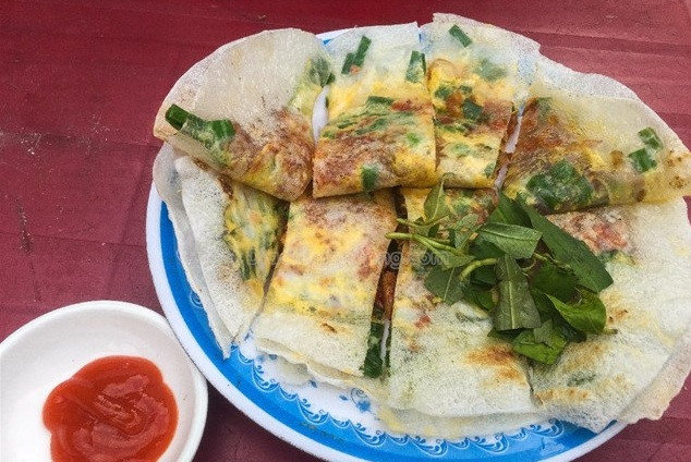 Món há cảo vốn không xa lạ nhưng nay trở nên hấp dẫn hơn khi được chế biến theo công thức mới. Thay vì đem hấp chín, há cảo phiên bản mới được chiên vàng đều trong chảo dầu lớn, sau đó đập một quả trứng phủ lên trên mặt, giống như “đắp mền” vậy á, rắc thêm chút hành lá làm dậy lên mùi thơm lừng. Khi ăn, bạn sẽ cảm nhận được độ giòn rụm của há cảo quyện với lớp trứng chiên beo béo, ăn kèm đu đủ bào sợi là ngon hết sảy luôn.