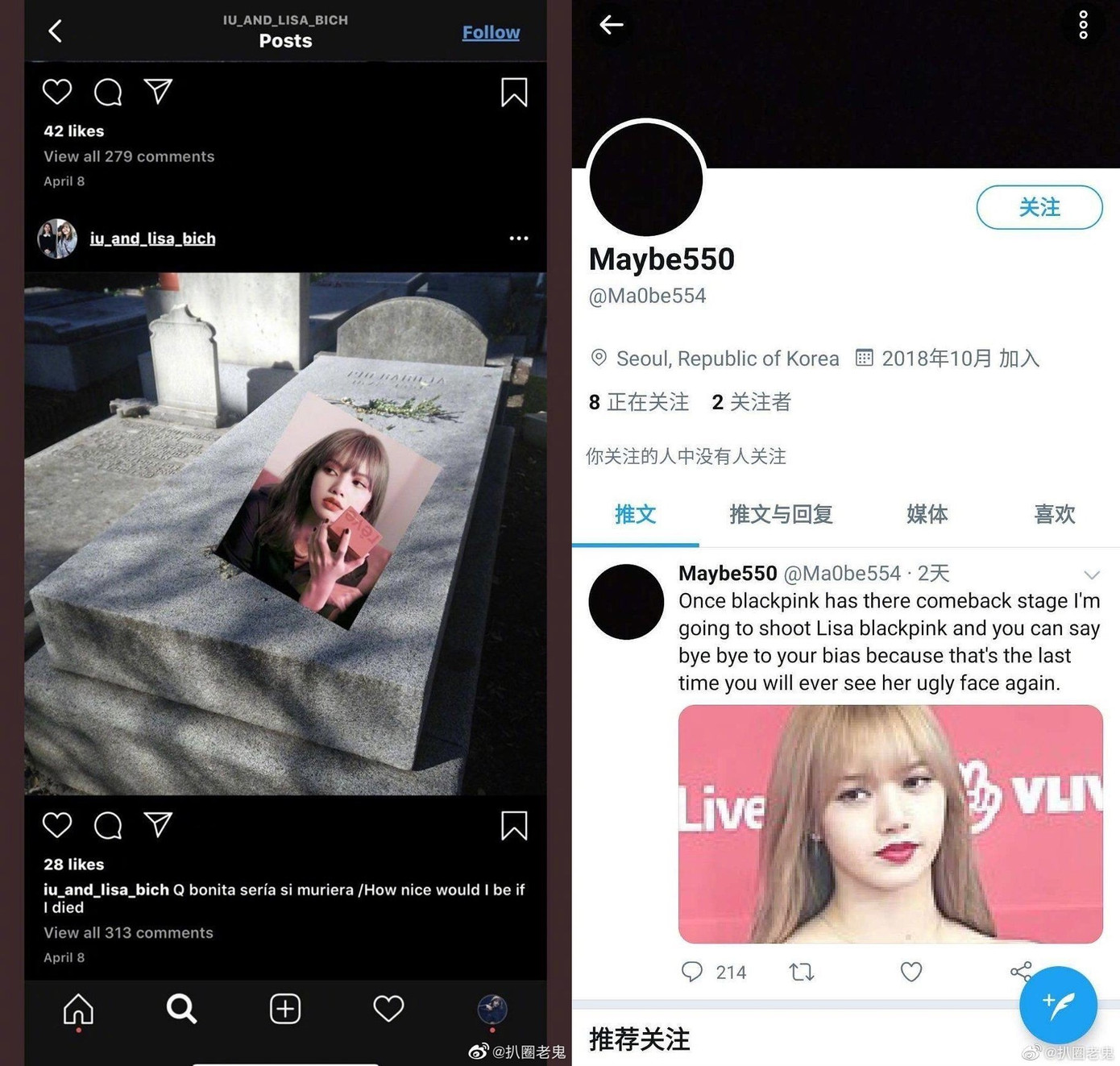 Tâm điểm khiến fan K-Pop lo lắng trong 24H qua chắc chắn là một tài khoản Twitter có tên @Maybe550 khi kẻ này lên tiếng đe dọa sẽ bắn Lisa khi nhóm BLACKPINK biểu diễn và không quên nhắn nhủ các fan hãy tạm biệt Lisa từ bây giờ là vừa. Một tài khoản khác là @iu_and_lisa_bich còn ghép ảnh Lisa lên bia mộ. Các fan của Lisa hiện đều rất hoang mang lo lắng, đề nghị công ty YG Ent hãy chú ý bảo vệ an toàn cho nữ idol.