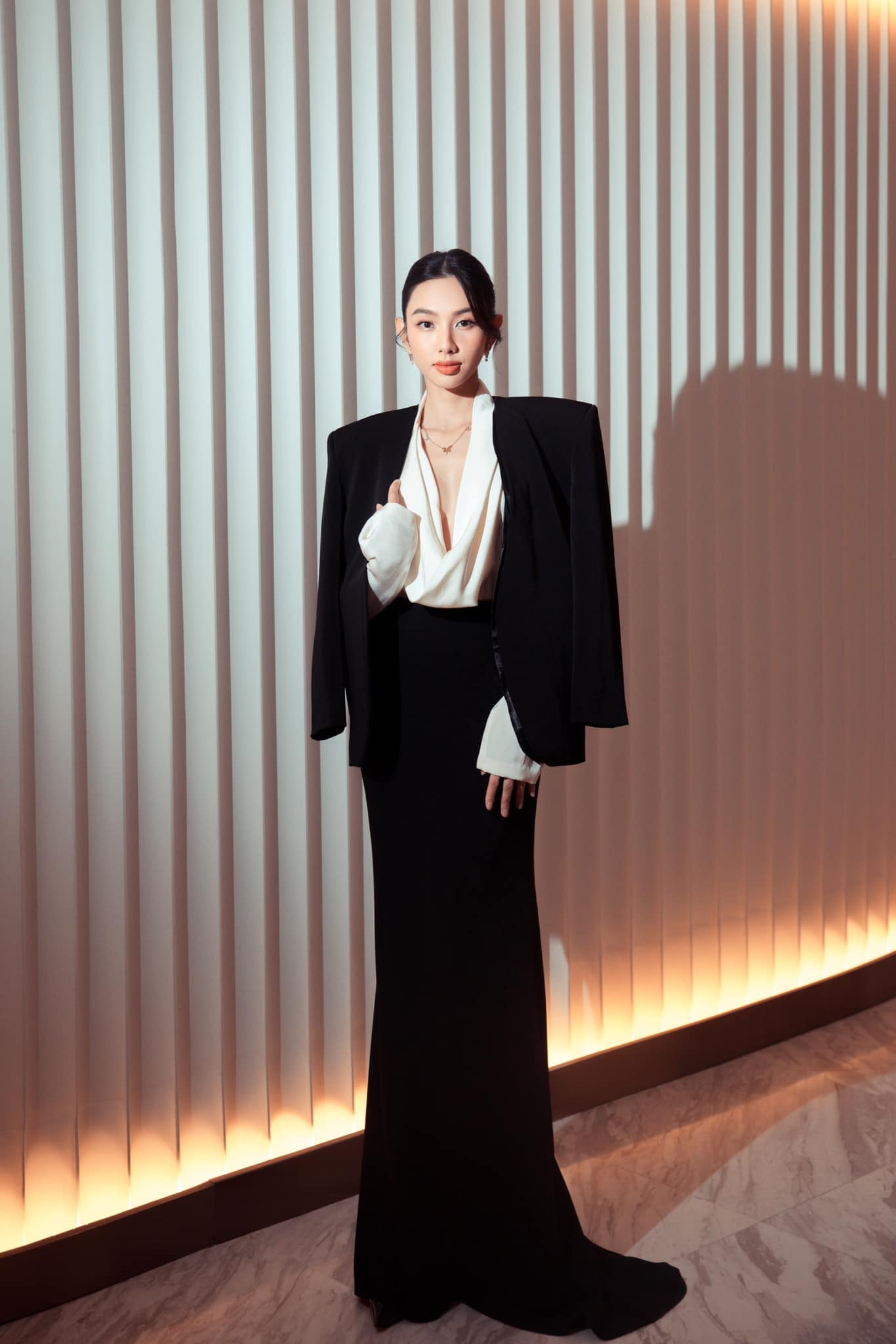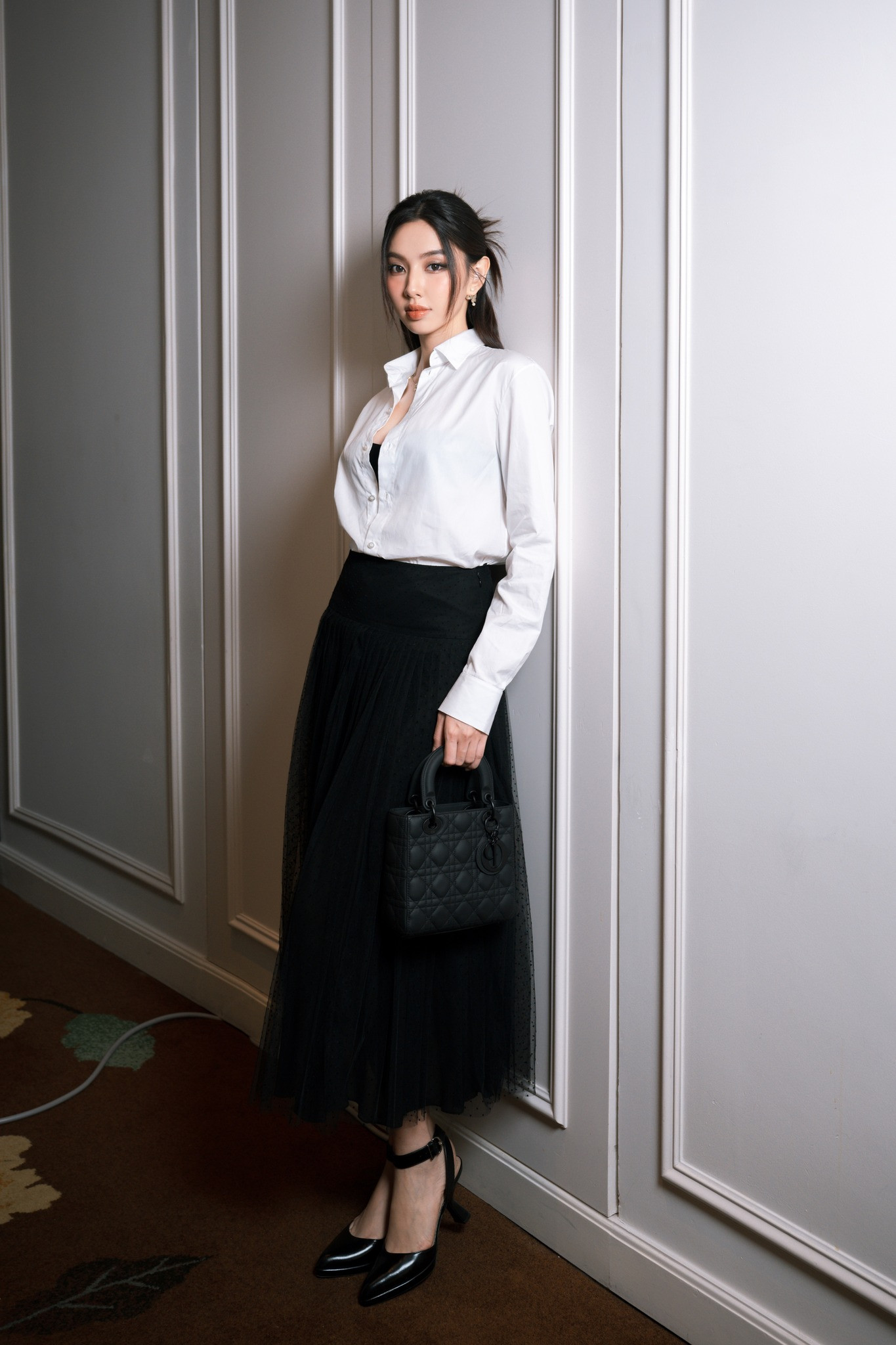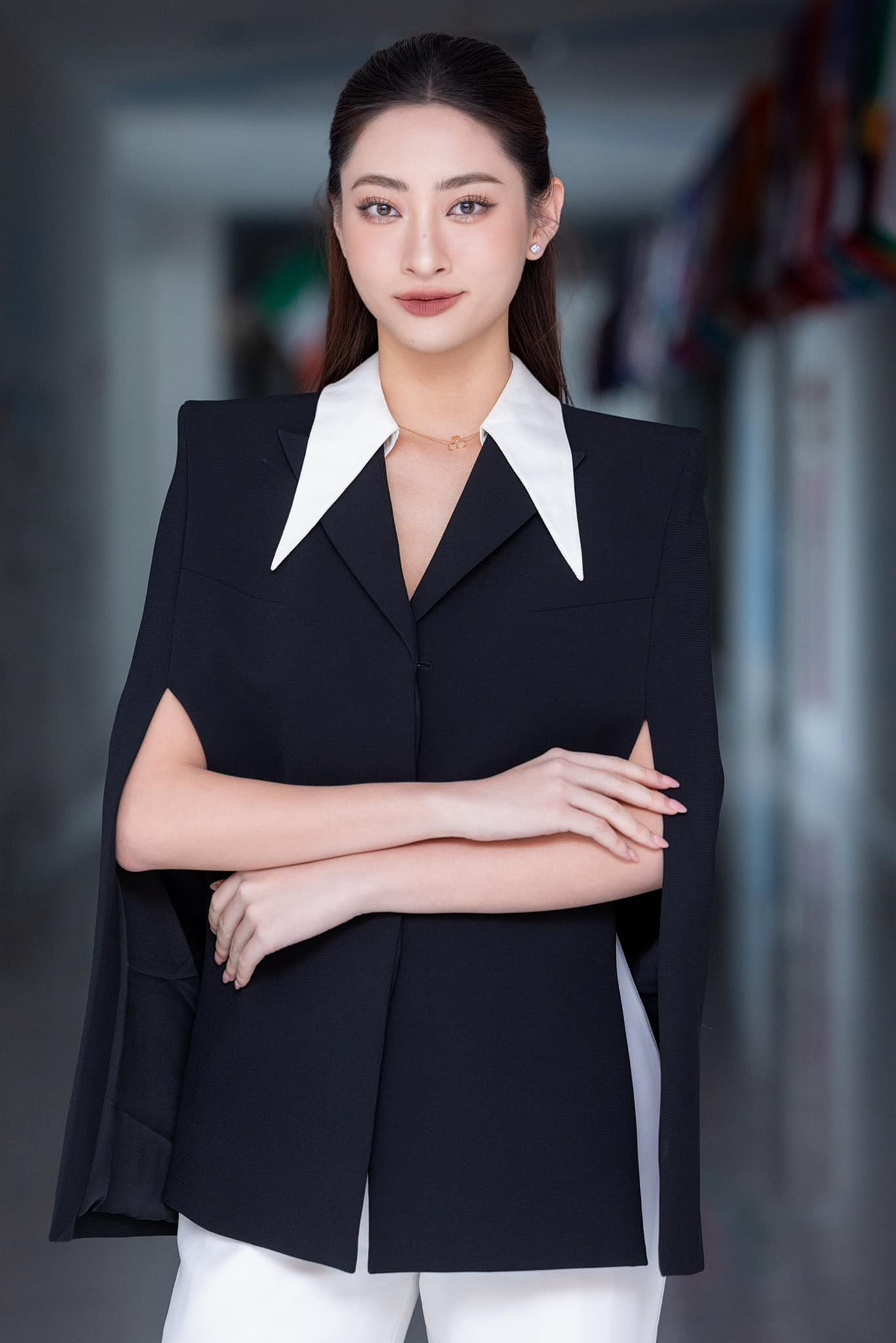 Hoa hậu Lương Thùy Linh biến hóa đa dạng với tông màu trắng đen. Với vai trò là diễn giả, Miss World Vietnam 2019 ưu tiên trang phục vest, sơ mi cách điệu, trang trọng. Tham dự các sự kiện thời trang, nàng hậu khoe khéo sắc vóc cuốn hút với các thiết kế khoe lưng trần.