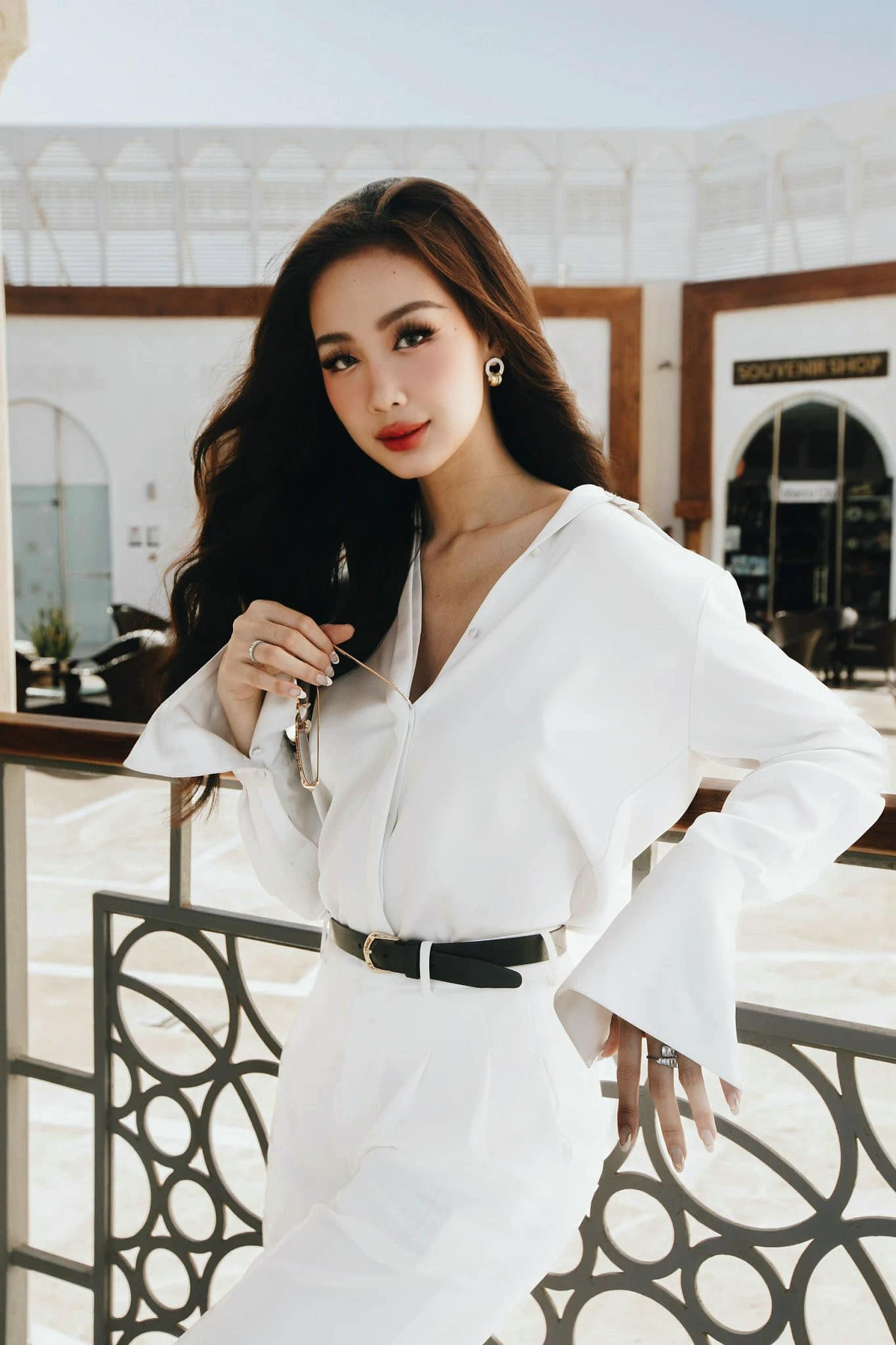 Tông màu trắng kem "chiếm sóng" trên trang cá nhân Hoa hậu Đỗ Thị Hà từ các show diễn cho tới thời trang thường ngày. Nàng hậu Thanh Hóa nhận được phản hồi tích cực từ khán giả nhờ khả năng phối đồ khéo léo, nhấn nhá trang phục đơn giản bằng phụ kiện thắt lưng, túi xách.