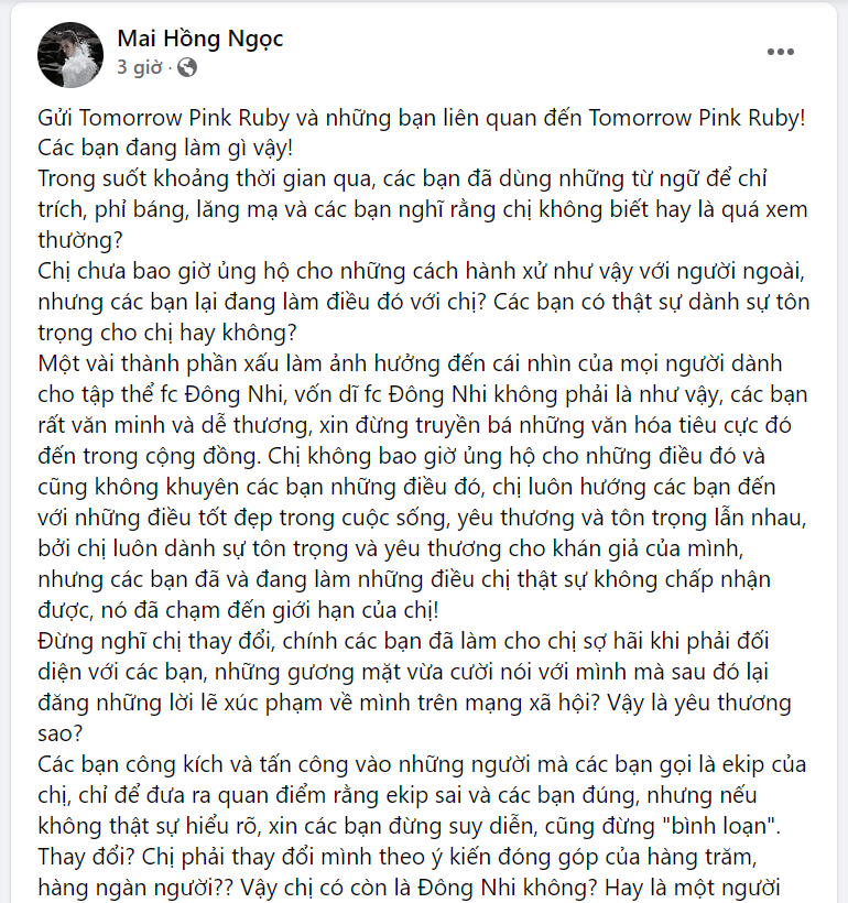 Hiện tại, cuộc "đấu tố" giữa một bộ phận fan Đông Nhi và ê-kíp của nữ ca sĩ đang trở thành tâm điểm tranh luận gay gắt của cư dân mạng. Trước đó, một thành viên trong fanclub của Đông Nhi tự xưng là admin kênh YouTube FC Đông Nhi gây chú ý với bài đăng bày tỏ sự bức xúc về cách làm việc thiếu chuyên nghiệp của ê-kíp nữ ca sĩ.