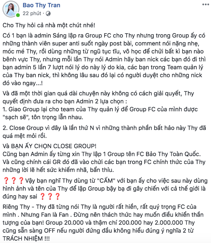 Theo đó, fan của cô nàng dường như đã làm gì đó quá đáng đến mức khiến giọng hát Là Con Gái Thật Tuyệt cảm thấy thất vọng và phẫn nộ, sau khi thỏa thuận sẽ khóa group này lại, cô còn nhấn mạnh: “Chị cấm không làm một cái group riêng nào nhắc đến tên chị nha! Tụi em muốn lộng hành ở đâu tụi em thoải mái. Đừng nhắc tên chị".