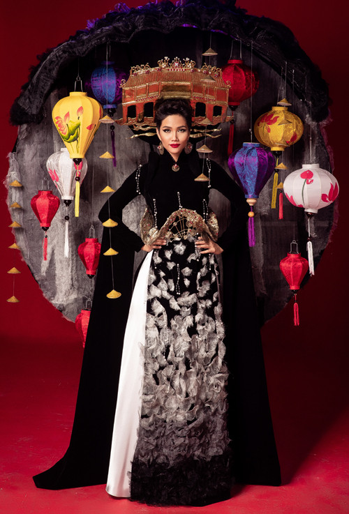 Điểm đáng cân nhắc là chiếc áo dài có màu đen để làm nền cho những chiếc đèn lồng màu sắc, vì thế có thể khiến H'Hen Niê bị chìm lấp.