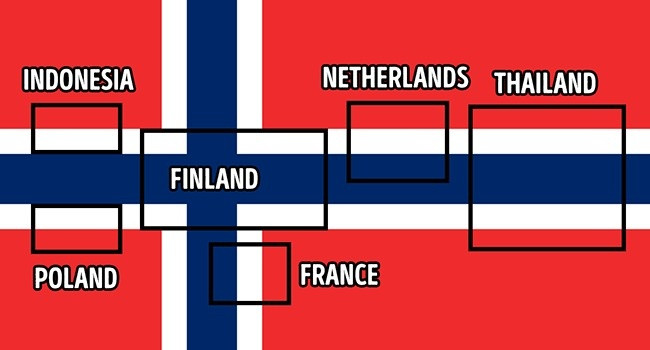 Cờ của Na Uy bao gồm cờ của tận sáu quốc gia khác là Indonesia, Phần Lan, Hà Lan, Thái Lan, Ba Lan và Pháp.