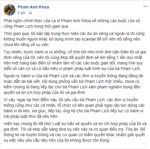 Theo đó Phạm Anh Khoa cho biết những lời cáo buộc của Phạm Lịch là vô căn cứ. Anh sẵn sàng đưa vụ việc ra tòa nếu Phạm Lịch đưa vụ việc đi qua xa.