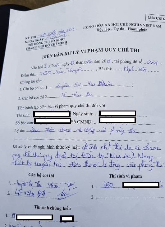 Biên bản được lập ngay khi tiếng chuông điện thoại của thí sinh vang lên.