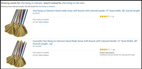 Trên trang Amazon của Mỹ, chổi đót Việt Nam cũng được bán với giá tầm 400K. Điều này càng thêm chứng tỏ, dân nước ngoài có vẻ rất thích hàng thủ công mỹ nghệ Việt Nam.