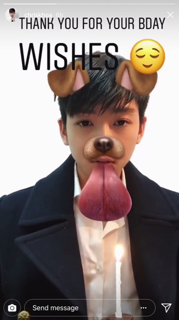 Nói là chia sẻ trên mạng xã hội nhưng thực tế, Chris Khoa cũng chỉ để hình ảnh này ở phần Story của Instagram. Hình ảnh chia sẻ cũng khá đơn giản, đó là ảnh Khoa selfie với tạo hình mặt chú cún con cùng dòng chữ "Thank you for your bday wishes" (Cảm ơn những lời chúc tốt đẹp của mọi người vào ngày sinh nhật của tôi).