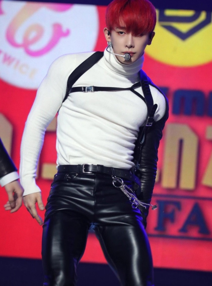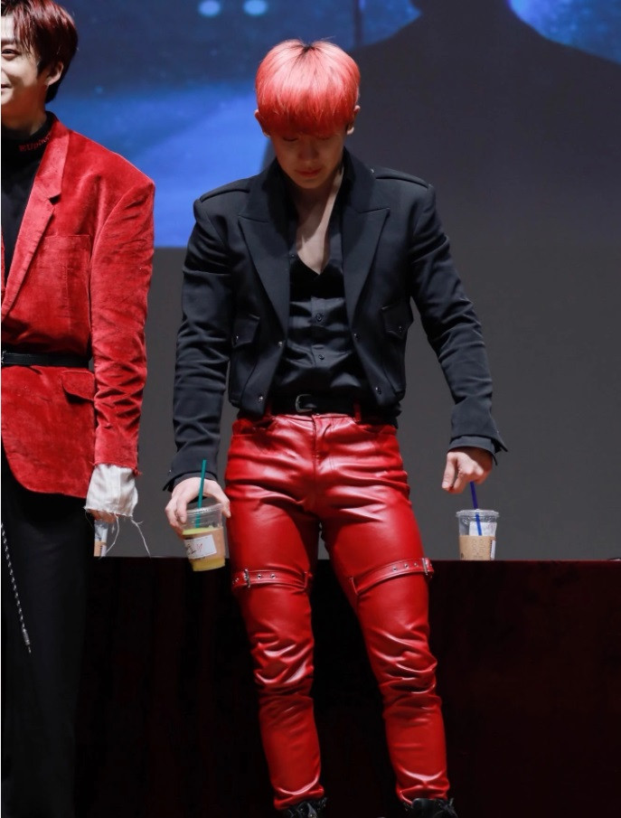 Quần da đỏ đã nổi bật lắm rồi, Wonho còn thêm hai chiếc thắt lưng bên đùi cho thêm ấn tượng.