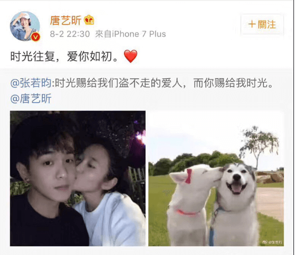Lãng mạn không kém cặp La Tấn - Đường Yên, Trương Nhược Quân - Đường Nghệ Hân cũng công khai chuyện tình cảm bằng hình ảnh và những câu nói đầy tình cảm. Trương Nhược Quân viết trên Weibo: "Thời gian ban tặng cho chúng ta người yêu thương không gì thay đổi được, còn em, ban tặng cho anh thời gian" và Đường Nghệ Hân đáp lại: "Thời gian xoay vần, yêu anh như thuở ban đầu".