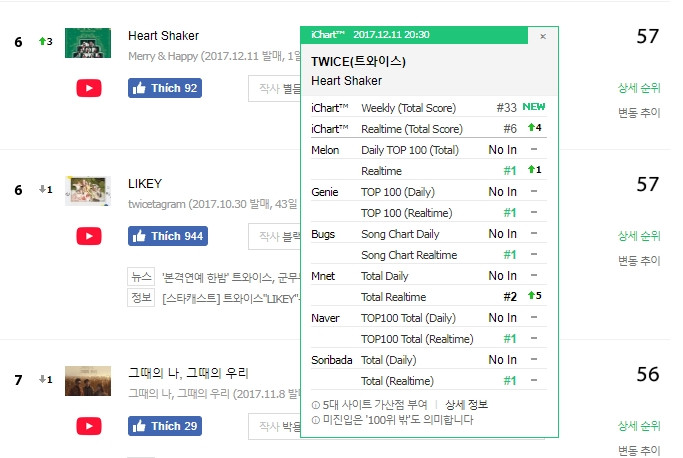 Hiện tại, ca khúc đang có phong độ rất tốt ở mảng nhạc số khi đứng đầu 5/6 bảng xếp hạng trực tuyến Hàn Quốc. Trong khi đó, Heart Shaker chỉ là một món quà đặc biệt mừng Giáng sinh mà thôi! Thành tích này phần nào thể hiện sức ảnh hưởng của TWICE.