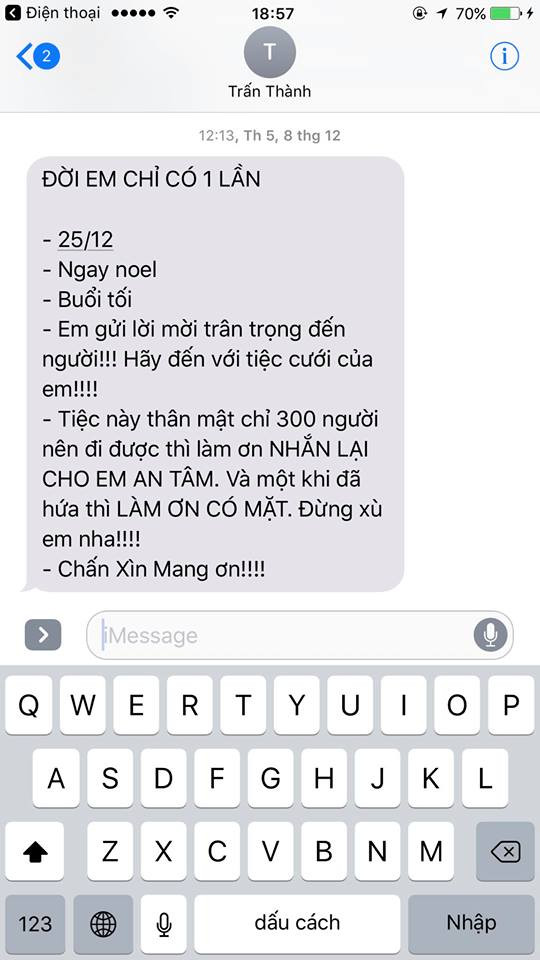Vậy là sau 10 tháng kể từ ngày công khai hẹn hò, Trấn Thành và Hari Won sắp chính thức trở thành vợ chồng. Mới đây Hoa hậu Thu Hoài - một người bạn thân của Trấn Thành, bất ngờ chia sẻ tin nhắn Trấn Thành mời cô tham dự đám cưới.
