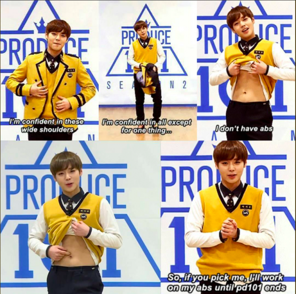 Còn nhớ khi mới tham gia show sống còn Produce 101 mùa thứ hai, chàng thực tập sinh Park Jihoon đã có một lời hứa vô cùng dễ thương. “Em là người khá tự tin vào bản thân mình, chỉ trừ việc em không có cơ bụng sáu múi săn chắc. Nếu mọi người yêu thương bỏ phiếu cho em, em nhất định sẽ tập luyện chăm chỉ để có cơ bụng chuẩn khi chương trình Produce 101 kết thúc”.