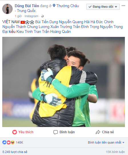 Mới đây, cầu thủ Bùi Tiến Dũng đã đăng tải hình ảnh kèm caption: “VIỆT NAM” đầy tự hào. Ngay lập tức, cộng động mạng đã nhiệt tình vào chúc mừng chiến thắng của anh cùng đội tuyển nước nhà.