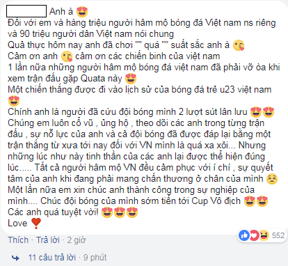 Dòng trạng thái của cầu thủ Bùi Tiến Dũng đã nhận được “bão” like và vô số lời chúc từ cộng đồng mạng.