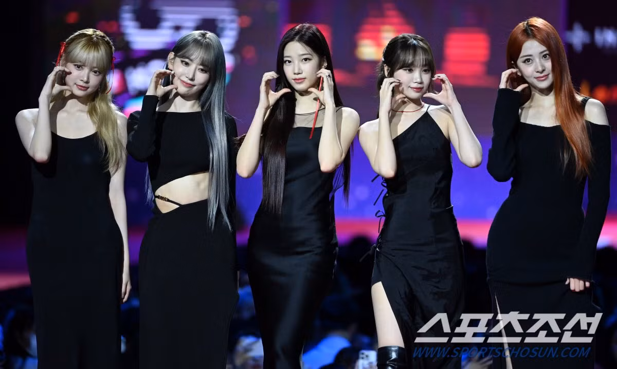 Một trong những cái tên đang lọt top tìm kiếm của dàn sao nữ là LE SSERAFIM. Nhóm quyến rũ, sang trọng trong những chiếc đầm ôm body đen, tạo điểm nhấn bằng phụ kiện như ruy băng, khuyên tai... đỏ.