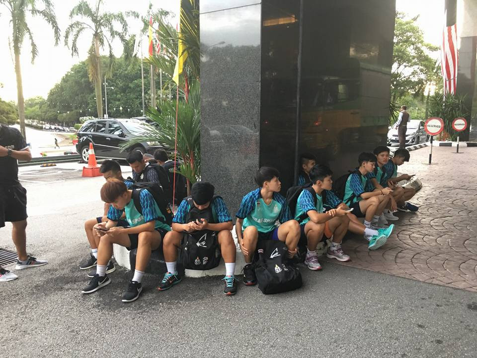 Cả đội đã phải chờ hơn hai tiếng ngoài cổng khách sạn vì không có xe vận chuyển. (Ảnh: FB Futsal Thailand)