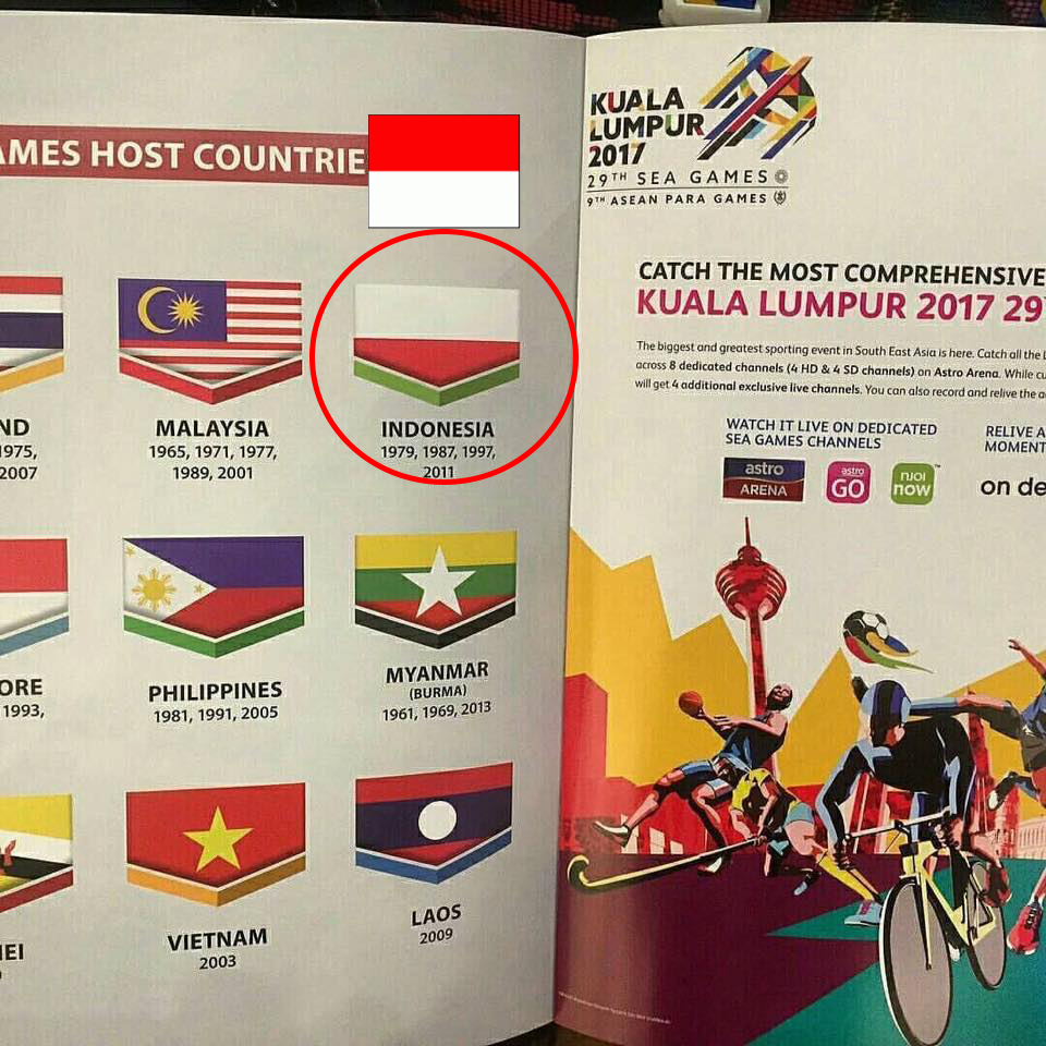 Trong cuốn sách hướng dẫn SEA Games 29 dành cho quan chức tham dự lễ khai mạc, quốc kì của Indonesia đã bị in nhầm thành cờ… Ba Lan.