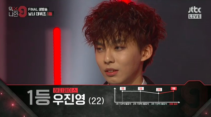 Woo Jin Young đã từng khiến các fan tiếc nuối khi anh chàng bị loại sớm ở Produce 101 (mùa 2). Vì thế các fan rất vui khi thấy Jin Young đạt được No.1 nhóm nam tại MIXNINE. Cô bạn Shin Ryu Jin với những gì đã thể hiện cũng hoàn toàn xứng đáng với vị trí No.1 nhóm nữ.