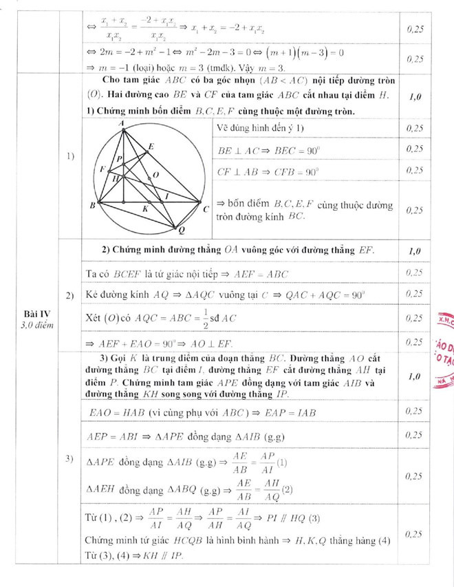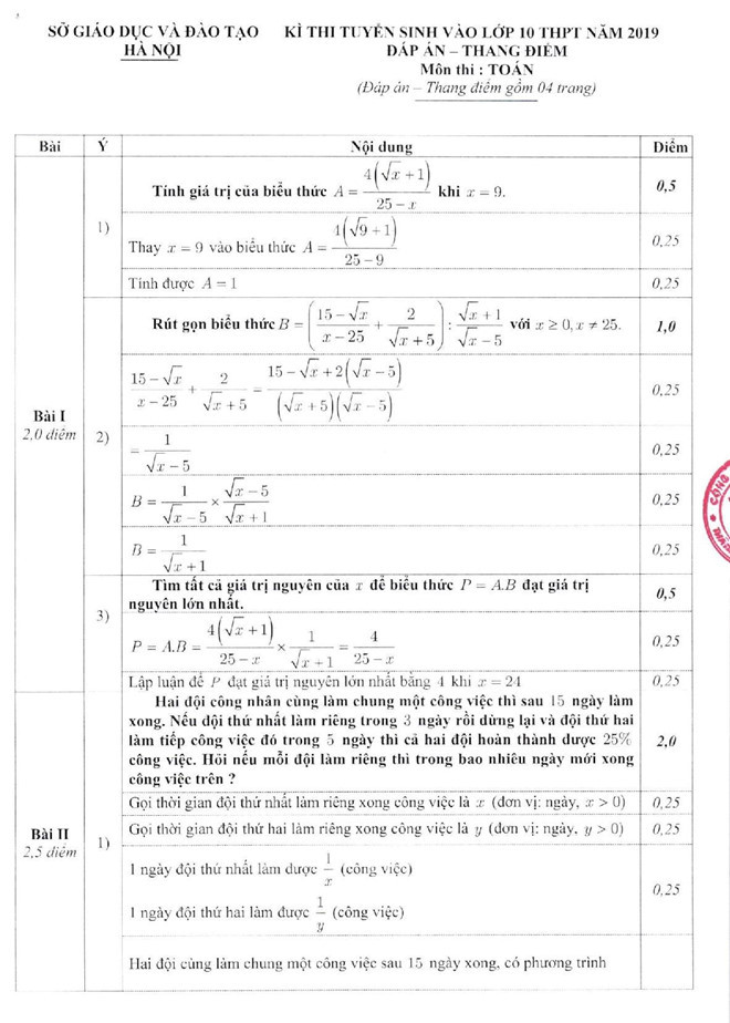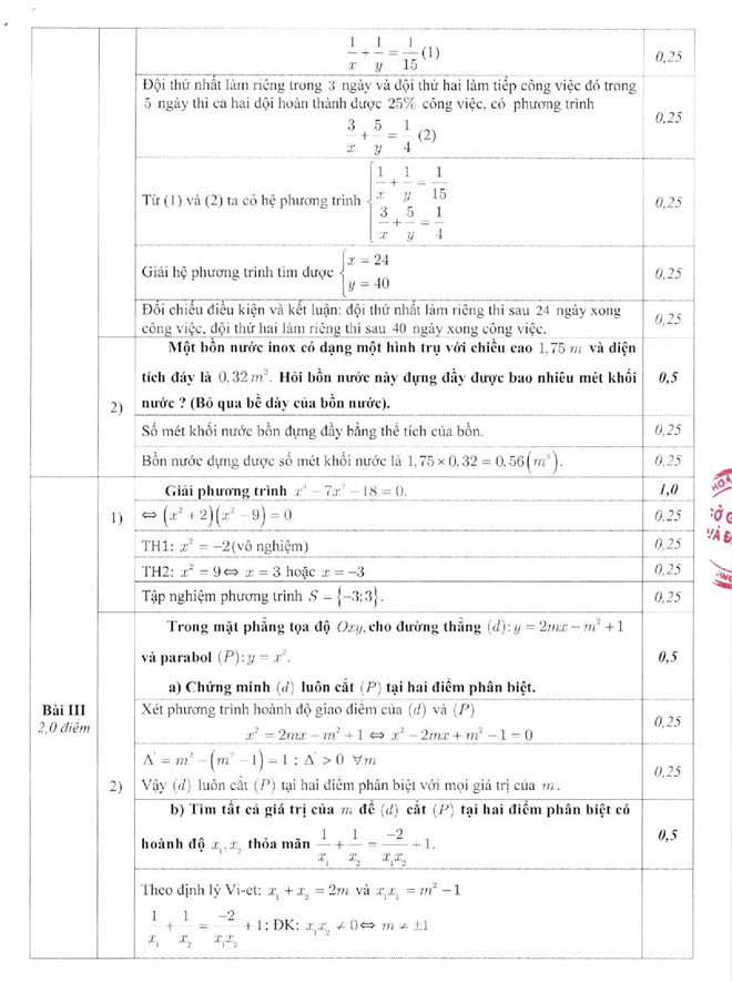 Đáp án môn Toán: