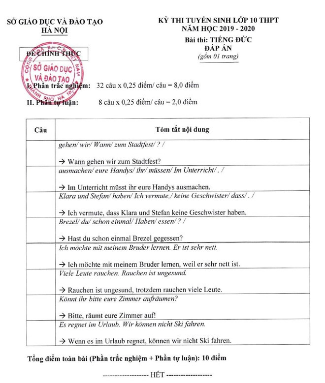 Đáp án môn Tiếng Đức: