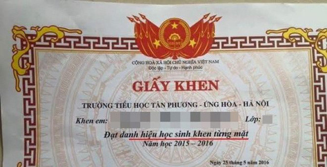 Đặc biệt năm 2016, Trường Tiểu học Tân Phương (Ứng Hòa, Hà Nội) đã phải thu hồi và viết giấy khen mới gửi đến từng học sinh vì dư luận phản ánh về tấm giấy khen “Đạt danh hiệu học sinh khen từng mặt”.