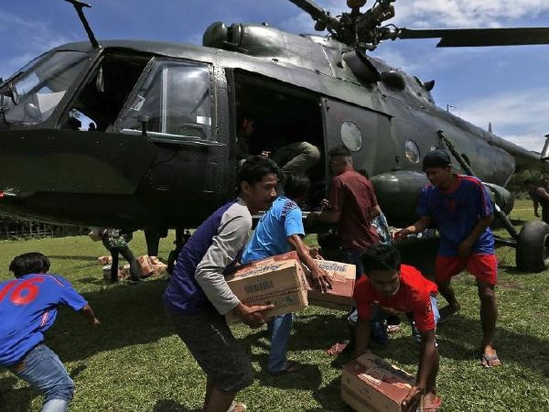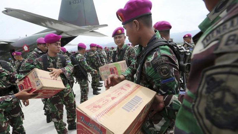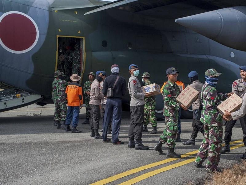 Hàng loạt máy bay chở hàng cứu trợ đã hạ cánh thường xuyên xuống thành phố Palu để binh sĩ dỡ hàng hóa xuống các xe tải hoặc trực thăng chuyển tới vùng gặp nạn.