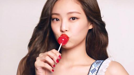 Cầm một cây kẹo mút đỏ rực như màu son cũng là một cách quảng cáo sản phẩm cực khéo léo của Jennie.