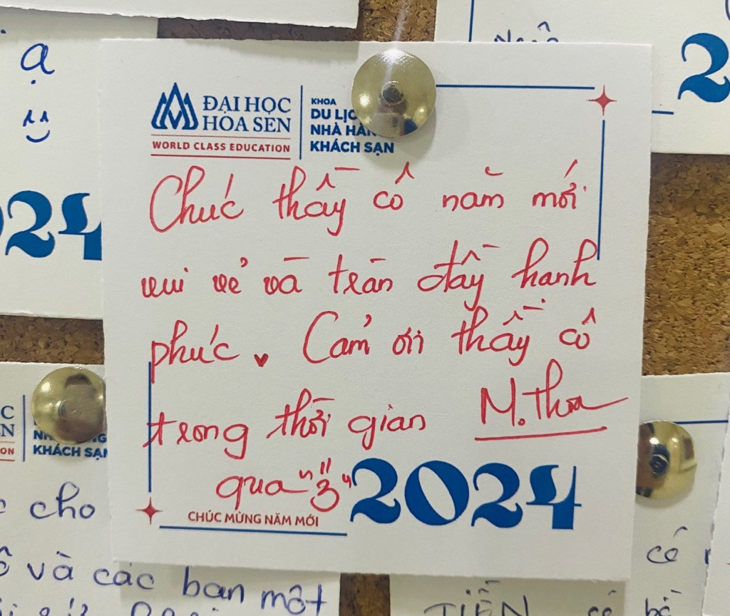 Đại học Hoa Sen tổ chức tặng hơn 10.000 phần quà Tết cho sinh viên đến cuối tháng 1/2024 trong các sự kiện như bảo vệ đồ án tốt nghiệp, thi cuối kỳ, workshop, talkshow... Đặc biệt, đi cùng quà Tết là những tấm thiệp do chính các thầy cô viết tay gửi đến các bạn sinh viên.