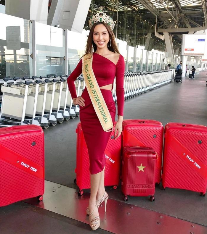 Trước đó, Thùy Tiên khi đặt chân về Việt Nam với chiếc vương miện Hoa hậu Hòa bình Quốc tế đã chọn cho mình bộ váy áo ôm sát màu đỏ rực rỡ, tông màu đại diện cho sự chiến thắng. Bộ váy đỏ đi cùng loạt vali cùng tông, đối lập với chiếc vương miện màu xanh càng giúp Thùy Tiên nhìn nổi bật hơn.