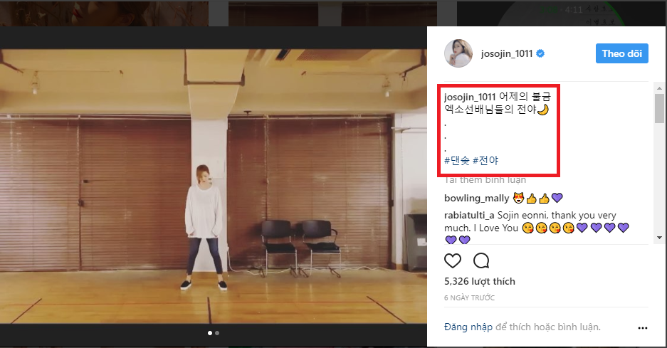 Gần đây, Sojin đã đăng tải một bài post với video dance cover The Eve của EXO lên Instagram cá nhân. Điều đặc biệt là Sojin đã viết caption là: “The Eve của EXO sunbaenim (có nghĩa là tiền bối EXO)”.