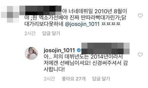 Ngay khi thấy dòng bình luận này, cô nàng Sojin đã lịch sự trả lời lại rằng: "Ồ... Năm ra mắt của tôi là 2014 cơ. Vậy nên họ chính là tiền bối của tôi đó. Cảm ơn vì những suy nghĩ của bạn!".
