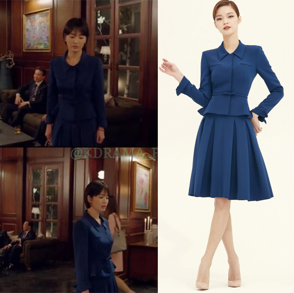 Một bộ váy Avouavou khác Song Hye Kyo diện trong phim là set blazer kèm chân váy xếp ly. Tông màu hoàng gia cùng kiểu dáng thanh lịch mang đến cho bà xã Song Joong Ki vẻ ngoài cổ điển. Giá của bộ cánh này cũng khá đắt đỏ, khoảng 14,3 triệu đồng.