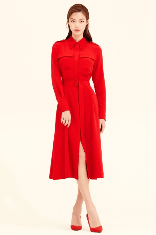 Đây là một thiết kế của thương hiệu nội địa Hàn Avouavou. Ngoài tông màu đỏ cam rực rỡ siêu tôn da, chiếc váy này có kiểu dáng thanh lịch, thắt lưng đồng màu giúp tỷ lệ thân hình thêm cân đối. Dù có mức giá không rẻ (899 nghìn won - tương đương 18,5 triệu đồng) nhưng sản phẩm vẫn gây sốt.