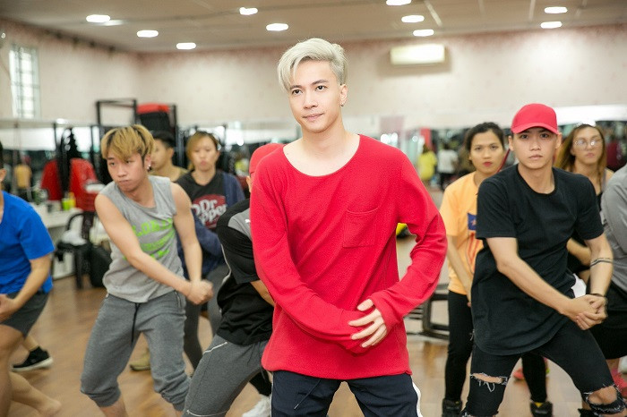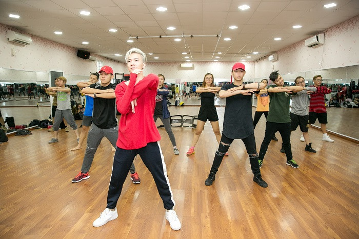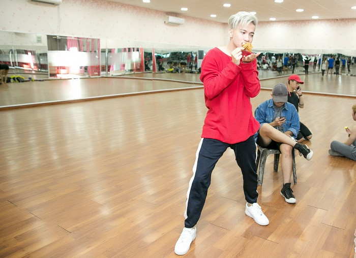S.T tranh thủ "bổ sung năng lượng" ngay trên phòng nhảy để kịp tiến độ tập luyện cùng cả team.