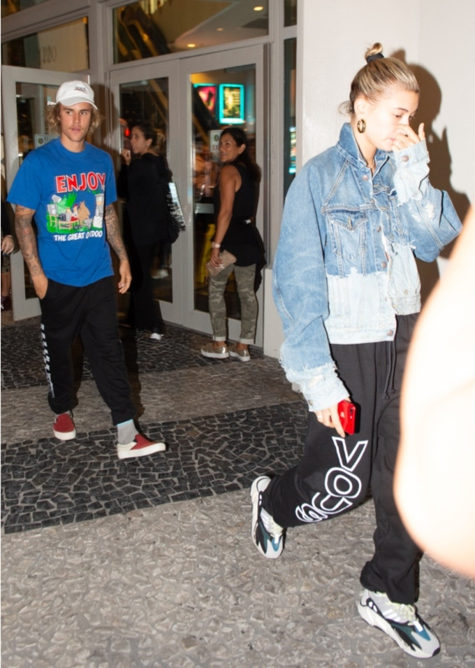 Justin Bieber và Hailey Baldwin cùng mặc sweatpant màu đen thoải mái trong chuyến đi chơi ở Miami. Justin kết hợp cùng áo phông màu xanh, giày vans hiệu Vault và mũ trắng còn bạn gái anh mix sweatpant cùng áo khoác denim và sneaker Adidas.