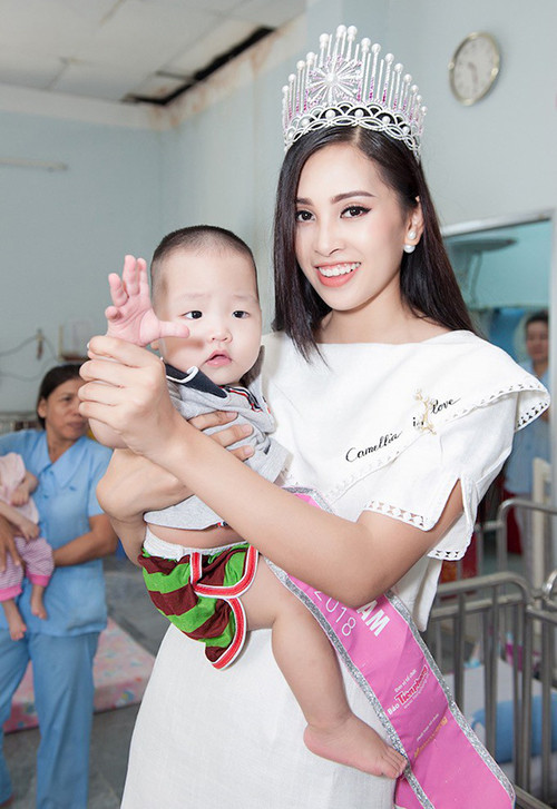Ngay cả khi đi từ thiện, Tiểu Vy vẫn gắn bó cùng váy trắng đơn giản, trông nữ tính nhưng có phần khá an toàn.