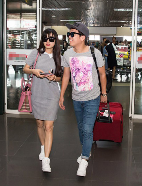 Ra sân bay, cặp đôi cũng cho thấy sự đồng điệu về trang phục. Đồ màu ghi phối cùng sneakers trắng, nhìn từ xa, ai cũng nhận ra họ là một cặp.