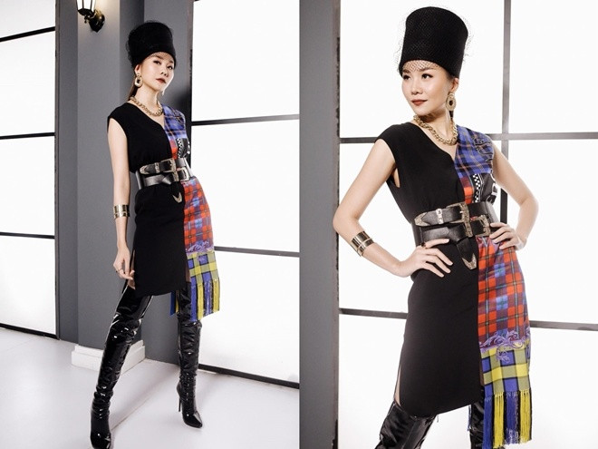 Kiểu mũ được NTK Đông Đông làm riêng cho Thanh Hằng được cô mix tinh tế cùng váy của Versace, boots và belt của IMIS', phụ kiện vòng, dây chuyền của Lovisa.
