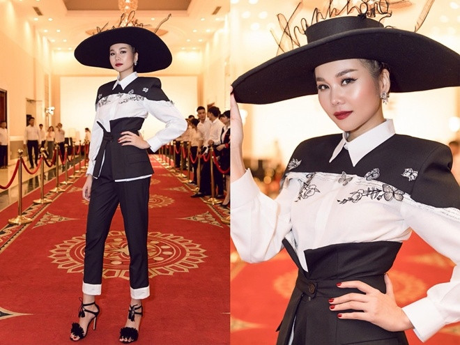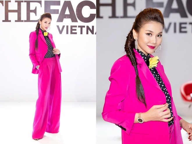 Lần đầu ngồi ghế nóng The Face, Thanh Hằng cho thấy sự đầu tư mạnh tay cho trang phục khi làm giám khảo. Ngay ngày đầu xuất hiện, cô đã chiếm spotlight, nổi bật hơn hẳn hai đồng nghiệp: Minh Hằng, Võ Hoàng Yến. Trong hình, mỹ nhân sinh năm 1982 diện bộ suit trắng - đen, kiểu dáng bất đối xứng của NTK Phạm Minh Tâm cùng mũ rộng vành in tên mình của NTK Đông Đông và sandals quai ngang của À Mon Avis.